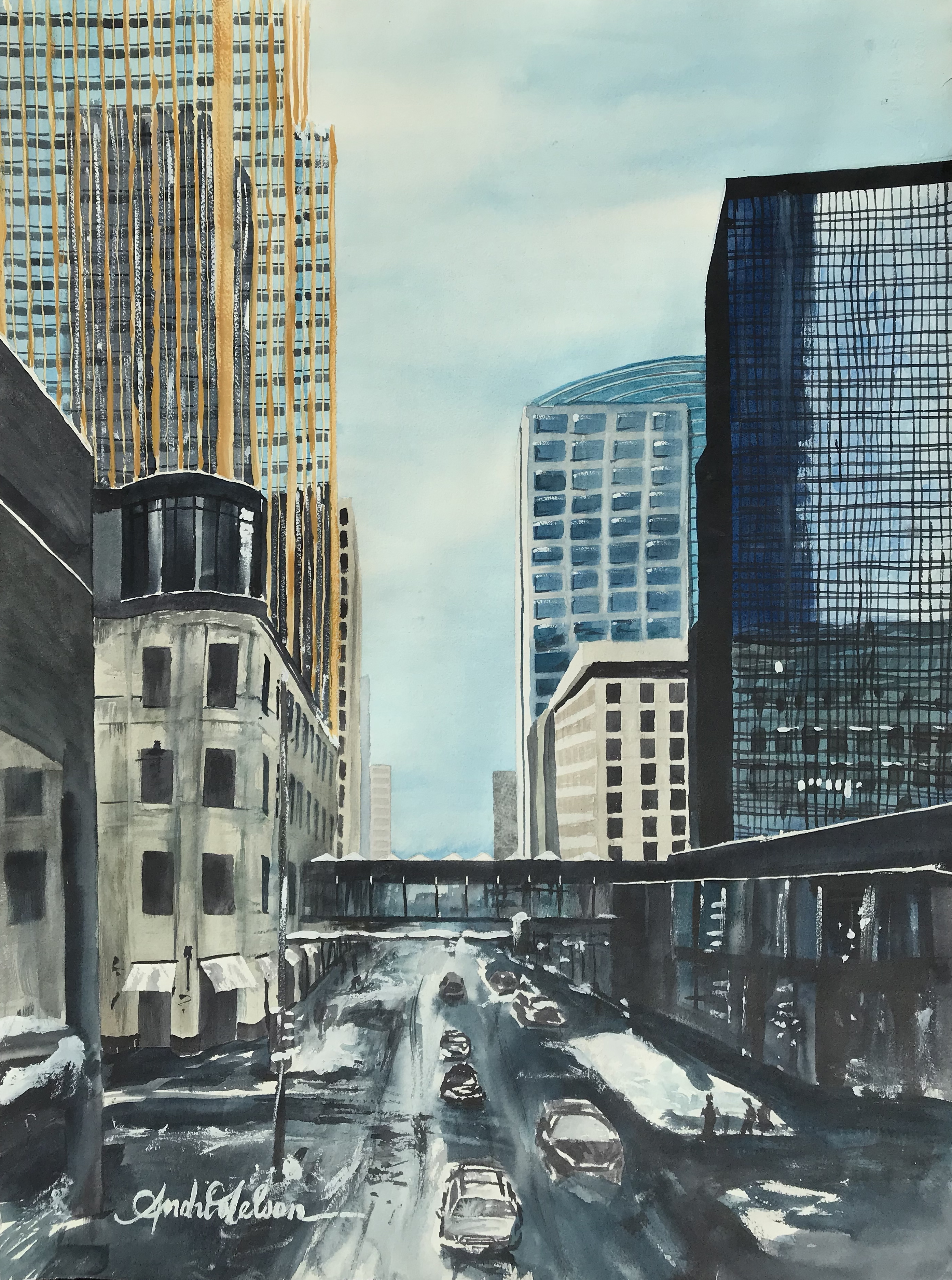 There is something beautiful about the messiness of winter in Minneapolis. I’m always amazed at how the snow opens up a world of grayscale on the sides of buildings and on the pavement. This is all easy to say, having taken the photo from a skyway and completed the painting in the studio, both far from the bitter cold of a Minnesota March.